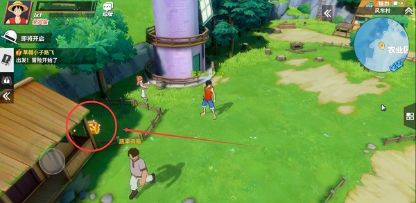 除了气球奖励外,风车村还隐藏了两个宝箱,他们的位置都在地图较为靠上方的区域。其中有一个在偏东北方的“农业区”被放置在了NPC“蔬果商贩”身后房屋的院子里,站在上图位置可以十分轻松看到。打开宝箱后可获得“黄金之果X20”奖励。