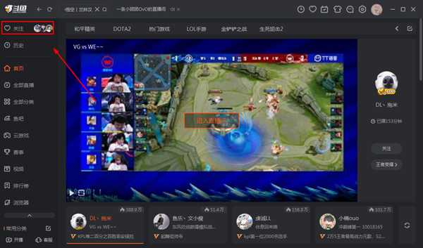 1、打开斗鱼直播软件之后,我们在页面左侧找到“关注”选项