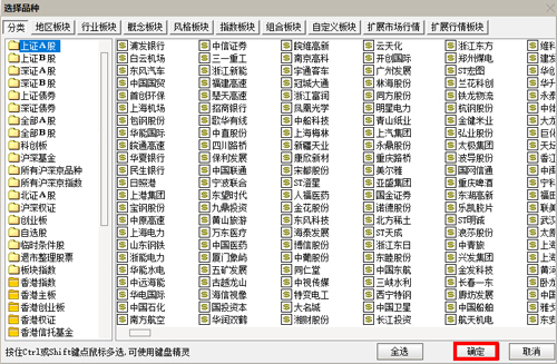 4、点击之后会弹出各种品种的股票类型,只需要选择你需要添加,也可以使用ctrl或shift进行多选,悬选择好之后点击确定即可。