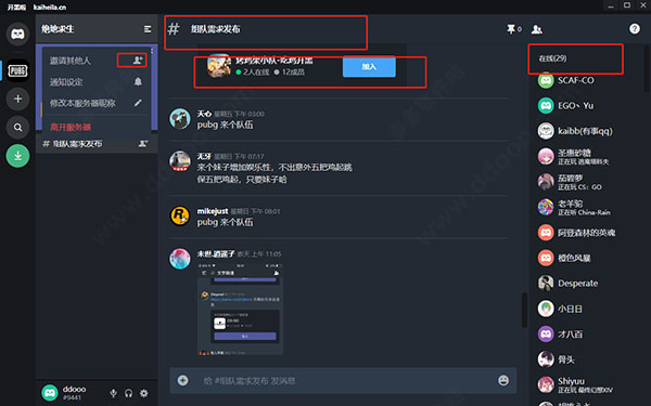 9、那么如果加入服务器,像小编这里随便点击公开服务器中的一个加入,进去后就是服务器的频道列表,右侧可看到海量小伙伴。同时你可以再文字频道中浏览历史信息,与其他用户实时聊天,也可以再语音频道中与其他用户实时语音。如果点击添加的按钮即可生成邀请链接,直接发给朋友们一起加入。