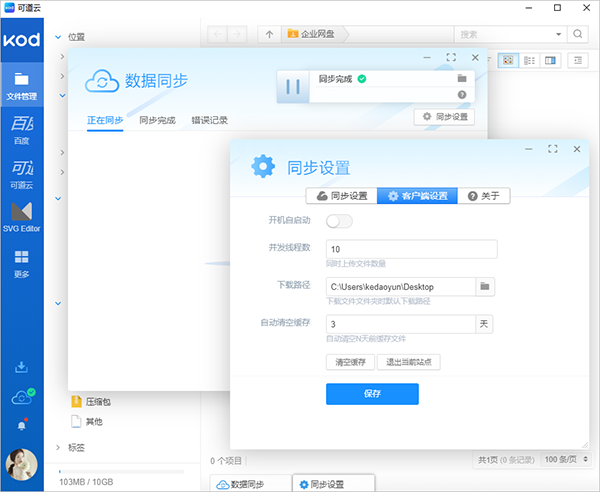 Kod“文件管理”页面,左侧栏可以设置同步功能(如下图所示)。设定“本地路径”指定文件/文件夹-同步至网盘指定目录下。