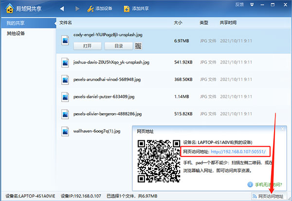 5、还可以在其他设备访问这个文件夹,点击软件右下角“网页访问地址”,即可得到一串链接。在其他设备的浏览器中打开这个链接,就能访问共享文件;