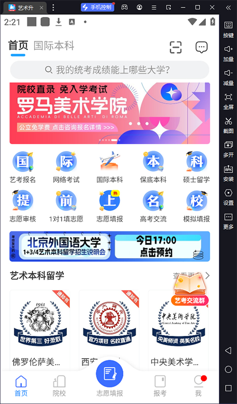 艺术升app电脑版是借助安卓模拟器运行的一款专业的艺术类院校报名服务软件。软件的功能十分的强大,覆盖了艺术生考试前的所有学习需求和考程需求以及考试之后的咨询需求。不仅如此,广大艺术生还能自其中查询国内外学校的基本信息和招生简章,甚至上学需要的费用也是一目了然,帮助大家更好的了解到心目中的学校,以便做好十足的准备。
