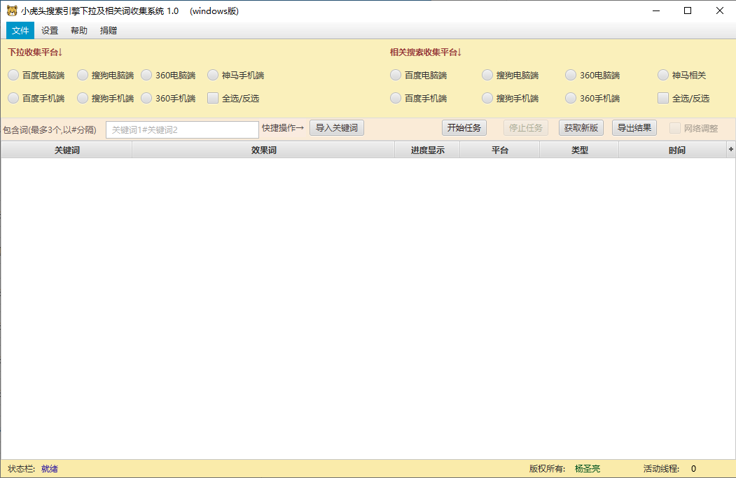 1、小虎头搜索引擎下拉及相关词收集系统的布局非常直观,几乎所有的功能都在主界面上,左侧为获取下拉词平台选择,右侧为相关词收集,按渠道选择。