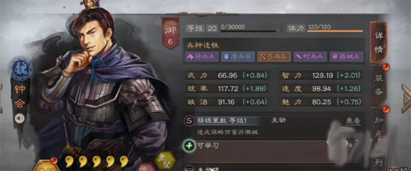 首先关银屏统御是6点,中规中矩,骑兵和枪兵是S级没有A级的兵种,其次六大属性:武力、智力、统帅、速度、政治和魅力的面板数值中仅有武力超过了2,达到了2.09,因此单看面板抒情真的挺一般,如果想玩关银屏需要让关银屏有一定的红度。