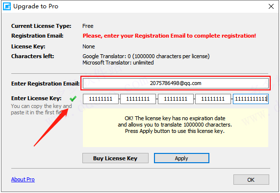 6、任意输入邮箱号(要符合邮箱的格式),序列号全部都输1,只到前面出现一个绿色的勾勾,点击“OK”即可破解完成。