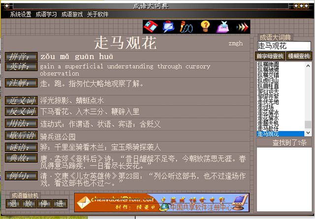全傻瓜似操作,精确查找、拼音查找、模糊查找成语不需2秒钟。真正实现"只有你想不到的,没有它查不到的"。