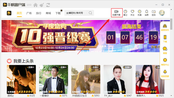 5、在【首页】右上角点击“我要开播”,跳转至开播直播间。