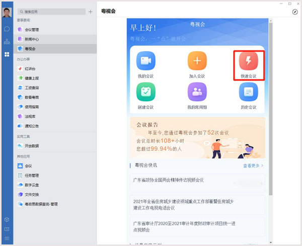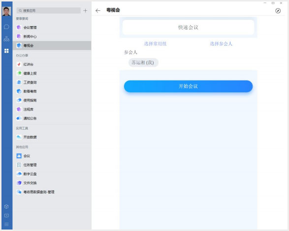 1、打开粤视会进入主界面,点击“快速会议”。只需选择 参会人 确认无误后点击“开始会议”。即可一步完成会议创建。您也可以通过“我的会议”对会议参数进行修改编辑。