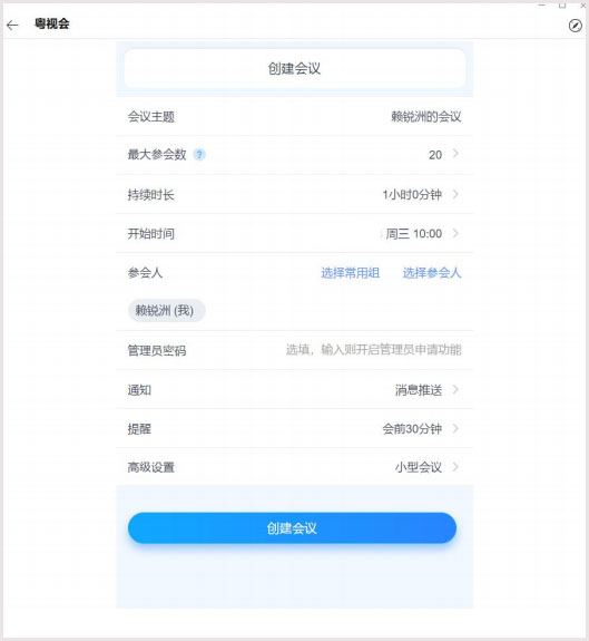 1、打开粤视会进入主界面,点击“创建会议”。根据实际情况填写会议主题– 最大参会数–持续时长–开始时间–参会人–管理员密码–通知–提醒–高级设置 以上信息确认无误后点击“创建会议”。即可完成会议创建。您也可以通过此处点击“进入会议”加入自己创建的会议中。