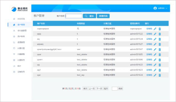 5、点击左侧导航栏客户管理按钮,可以查看客户名称、所属渠道、计费方案、管理员账号;