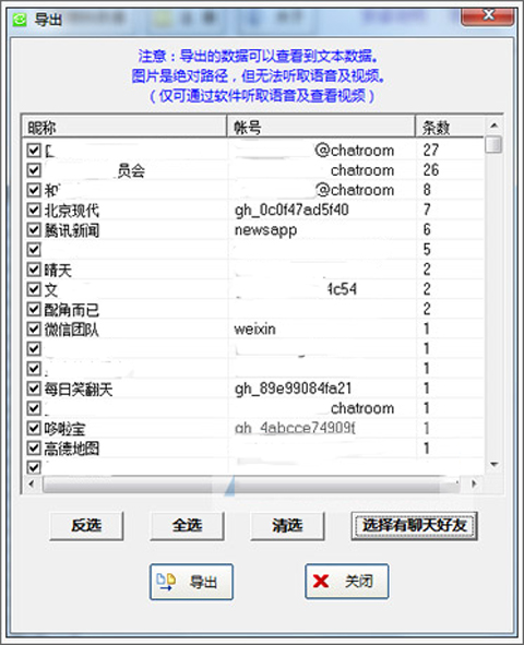 4、可以将微信聊天记录导出为html文件,这样下次查看时,您不打开本软件也可以进行查看了。在软件上点“导出聊天数据”。界面如下所示