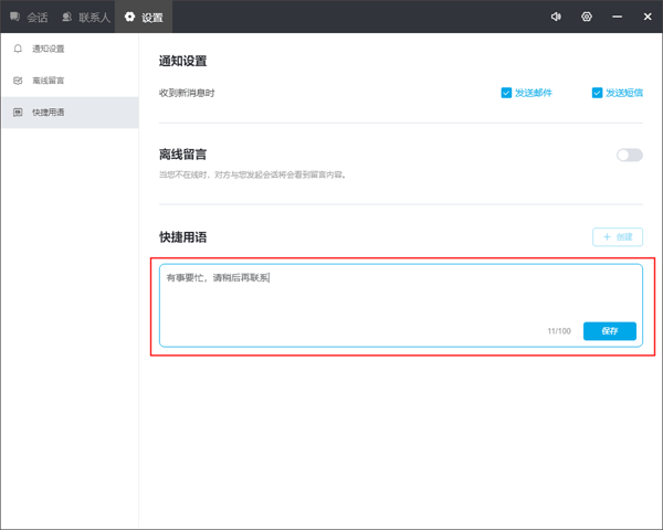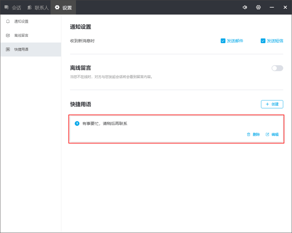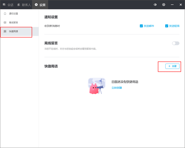 1、选择切换到【设置】界面,一共分为了三通知、离线留言、快捷用语这三个部分,点击快捷用语右边的“+创建”功能按钮。