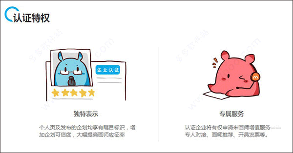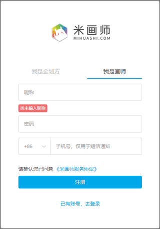 首先,我们找到米画师的官网,选择“我是画师”按钮进行注册,注册成功之后会跳转到申请画师认证的页面,需要填写你的个人信息以及作品,如果你是一个比较有名气的画师,几乎很快可以通过,如果反之可能会面临不通过的问题。