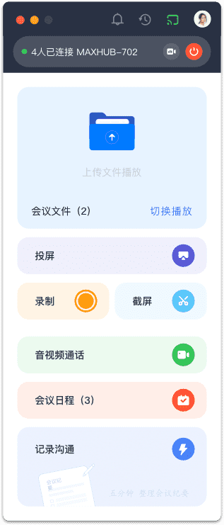 一键连接:连接MAXHUB会议平板,实现个人终端设备无线传屏、汇报/讨论资料的无线传输并展示,实现工作灵活汇报。