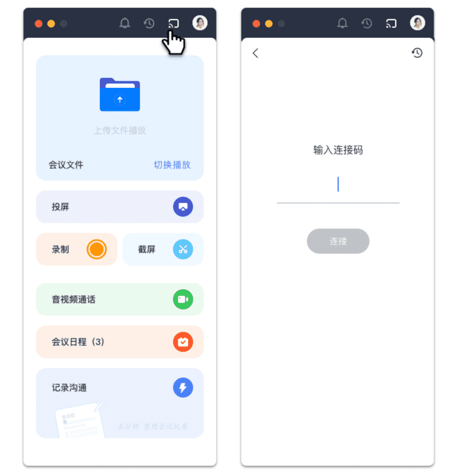 若个人设备与会议平板均连接广域网时,连接成功后即可使用投屏/文件共享/录制/截屏等功能。