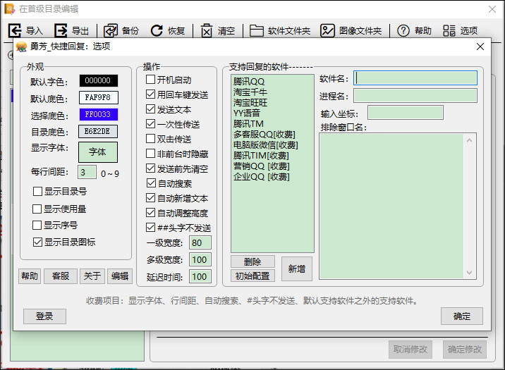 2、支持任意软件:默认支持了QQ、TM、YY、千牛、旺旺,其它软件请自己在选项中设置(有极少数软件窗口结构特殊,可能无法正常工作)。