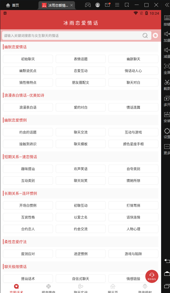 冰雨恋爱情话电脑版是由四川冰雨教育咨询有限公司推出的一款借助模拟器运行的专用聊天类软件,内置丰富的聊天话题,全程畅聊无阻,让您分分钟学会场合交际,这里提供了多样有趣的主题,24小时全天供给,你想怎么聊就怎么聊。