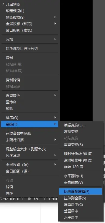 如果你上面完全按照我说的进行的设置,那么这里的视频应该是自动铺满画面的,如果没有,那就右键视频的画面--变换--比例适配屏幕。