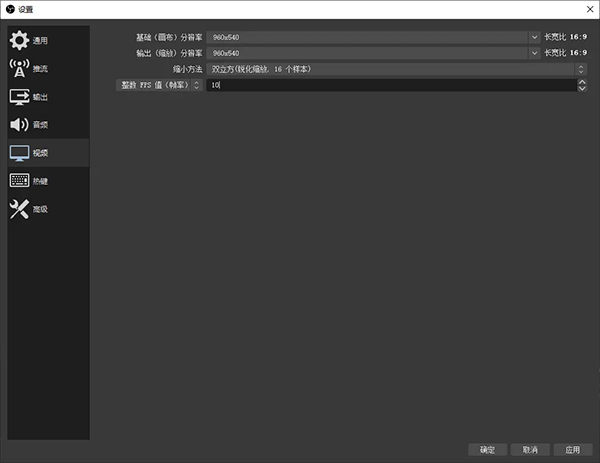 两个分辨率都手动输入“960x540”,帧率设置:点击左侧“常用FPS值(帧率)”,改为“整数FPS值(帧率)”,之后左侧便可以手动输入“10”。