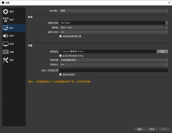 设置的侧边栏--输出--录像--录像路径,选择一个你认为合适的存储录像文件的位置。