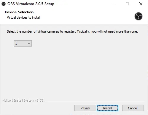 选择需要安装几个虚拟摄像头,一般情况下只用得到一个,所以这里保持“1”不用动,直接下一步即可