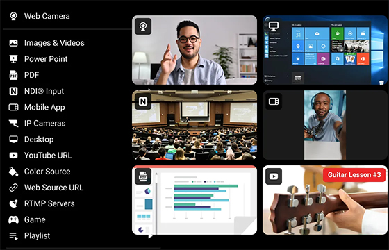 使用高达200个视频源创建专业的直播视频。将网络摄像头、预录制视频、图片、电脑屏幕、应用程序、网络来源等更多内容添加到您的直播流和录制中。轻松切换不同来源,吸引您的观众。