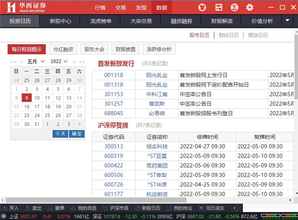5、在“数据”中也是可以进行:投资日历、新股中心、龙虎榜单、大宗交易等。