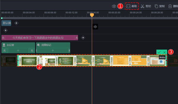 在时间轴中选中添加的视频,然后点击【截取】按钮,可以通过左右两侧移动截取视频,也可以直接移动截取区域进行截取,最后点击“√”保存截取设置
