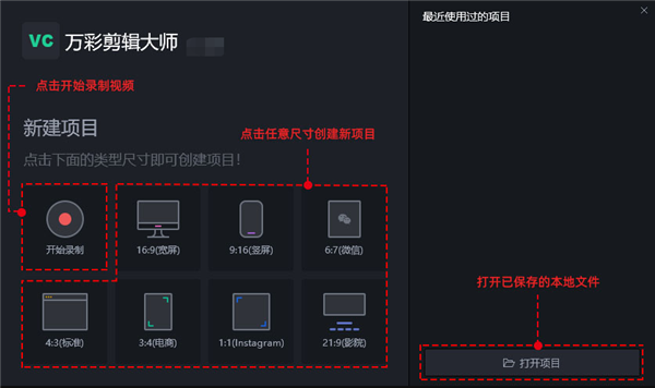 在该软件中,创建项目的方式有三种:1、点击开始录制创建视频项目,2、直接点击任意尺寸新建项目,3、打开已保存的本地文件继续编辑