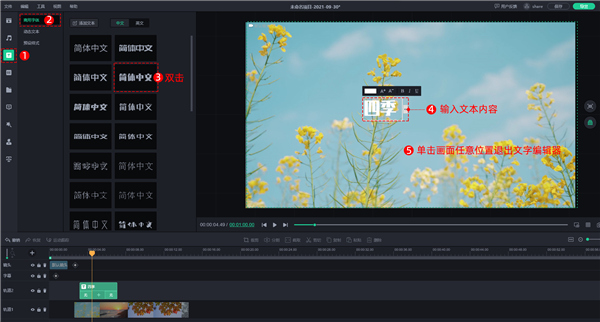 ① 添加文字。依次点击【文本】图标 >> 选择【商用字体】 >> 双击任意一种字体 >> 在文字编辑器输入文本内容,最后单击画面的任意位置退出文字编辑器