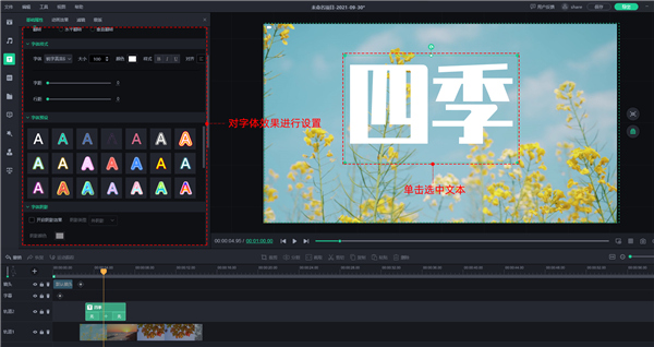 ② 修改字体样式。点击选中【文本】,在界面左侧的菜单栏中可以对字体类型、大小、阴影等样式进行设置。