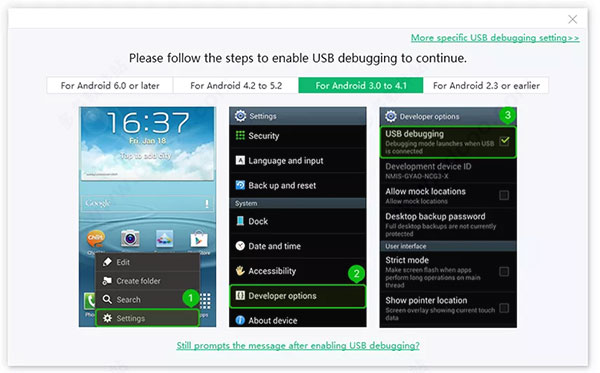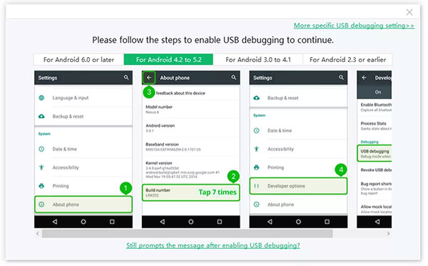 3)适用于Android 4.2或5.2 :“设置”>“关于设备”>点击“内部版本号”7次,直至收到“您处于开发者模式下”的注释“<返回”设置“<”开发者选项“<打开”USB调试“。