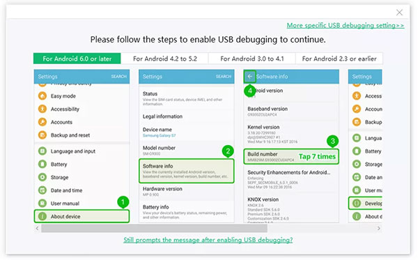 4)适用于Android 6.0或更高版本 :“设置”>“关于设备”>“软件信息”>点击“内部版本号”7次,直至收到“您处于开发者模式下”的注释>>返回“设置”>“开发人员选项”>打开“ USB调试“。