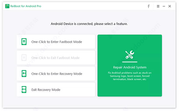 1、在PC上下载牛学长安卓手机修复工具(ReiBoot for Android),将您的Android设备与PC连接。从主界面中选择“一键进入快速启动模式”。