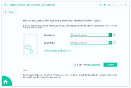 Android数据提取可检测手机的“设备名称”和“设备型号”。 点击“确认”按钮,移至下一个窗口。 如果它们与您的手机不匹配,请手动更正它们。 接下来,按照个性化的屏幕说明将手机置于下载模式。 然后单击“开始”按钮,获取必要的固件。
