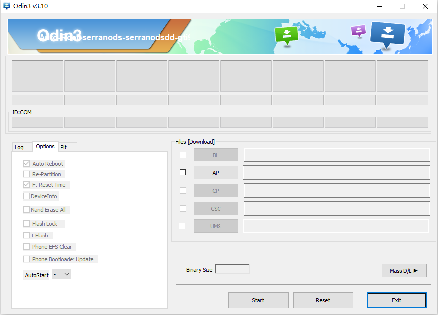 5、请稍等片刻,直到Odin窗口上的“ ID:COM”栏变为蓝色。 单击“ AP”按钮,同时默认情况下保持其他选项处于选中状态。 然后将显示一个文件资源管理器窗口,找到您保存从CF Auto Root ZIP提取的文件的文件夹。 选择名为“ CF-Auto-Root-XXX-XXX-XXX.tar.md5”的文件,然后单击“打开”按钮。