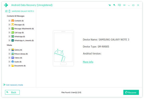 进入详细信息窗口时,数据类型将显示在左侧列中。 选择适当的数据类型,例如消息; 那么您可以在右侧面板上查看内容。 选择您要备份的所有内容,然后单击“恢复”按钮。 几秒钟后,您可以断开手机并开始生根。