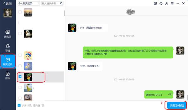 首先等待软件扫描完后,在左侧选中聊天记录,然后在列表中勾选想要恢复聊天记录的好友对话框,接着点击右下角“恢复到电脑按钮”,选择恢复文件的存储路径,最后在电脑上查阅恢复的聊天记录。至此微信聊天记录的恢复就完成了。