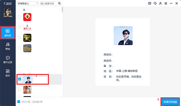 首先在页面左侧点击通讯录(群组),然后在列表中选中想要恢复的好友,接着点击右下角“恢复到电脑按钮”,选择恢复文件的存储路径,最后在电脑上查阅恢复的好友信息,至此微信好友的数据恢复就完成了。