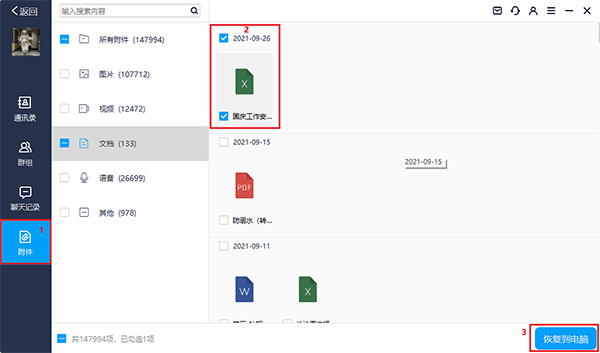 首先在页面左侧选择附件,然后根据附件类型及时间信息选中想要恢复的附件,接着点击右下角“恢复到电脑按钮”,选择恢复文件的存储路径,最后在电脑上查阅恢复的附件信息,到这里微信附件数据恢复就完成了。