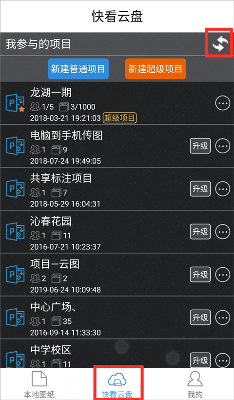 4、最后在手机版中切换至“快看云盘”并点击右上角的“刷新”,即可看到并打开项目,点击项目中的图纸就可以打开查看了~