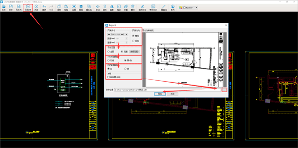 设置好尺寸大小、图纸方向、选择框选范围、PDF颜色、背景颜色、线条加粗、导出位置等等。
