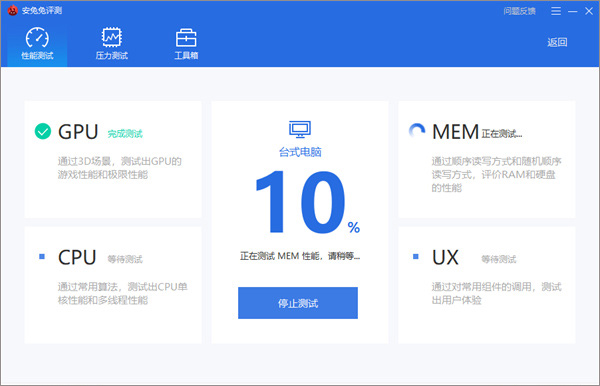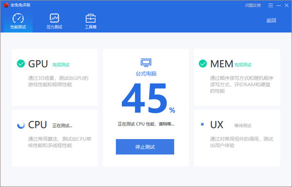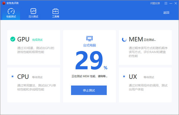 5、点击立即测试,与其他平台的安兔兔类似,电脑版的也提供了四大测试项目,分别为cpu,gpu,mem和ux,开始测试之后就不要操作电脑,等待测试结束,以免干扰测试结果。界面中间会显示测试的进度,达到100%则为测试结束,如果不想测试也可以点击停止测试来结束;