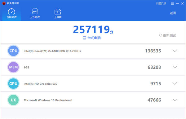 安兔兔评测电脑版是由北京安兔兔科技有限公司开发的一款面向电脑的专业测试软件,旗下手机版本的安兔兔相信广大网友应该是非常熟悉了,这次安兔兔重磅推出了安兔兔评测pc版本,相较于手机版本,软件整体界面干净清爽,功能简洁,用户可以非常快速的了解自己的各个硬件的多种信息,更加清楚它的性能;也可以用于辨别硬件真伪,了解详细参数等。而且软件还专门为测试GPU添加了光追测试系统,让你更加了解你的硬件,欢迎有需要的朋友下载体验。