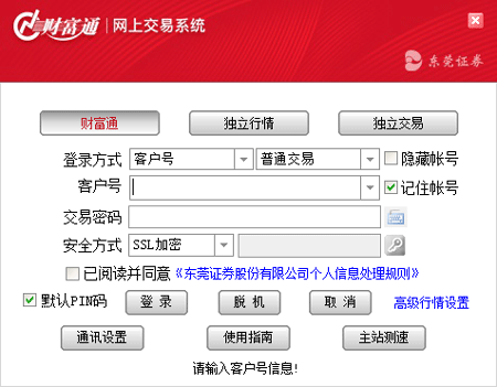 本款东莞证券软件界面美观大方,画面精美细腻,操作直观方便,功能强大完善,并拥有多种登陆方式,再加上多种分析画面,方便的分析工具,以及丰富的画线工具,是你证券投资的好帮手。请注意:登录时请确保选择正确的交易通道(普通交易或信用交易)。