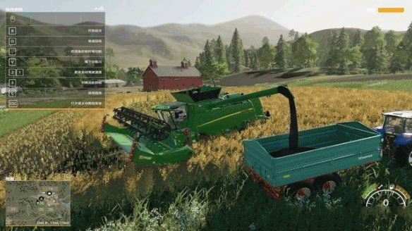 ③收割工作完成后,将收割机开到田边的拖车旁,O键将管道伸出,让收割完的谷物全部装进拖车内。
