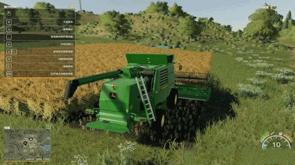 ①待到庄家长成,收获的时间就到了。E键进入前方的收割机,将收割机和前方的割台拖挂起来。