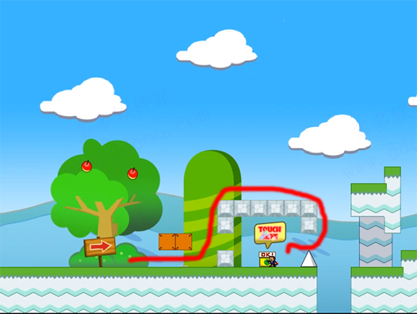 1、游戏开局要小心堡垒中的拳击险境,按照图中红线顶出方格子踩着走即可;