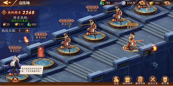 2、在竞技场中可以看到与自己排名相仿的敌人,挑战成功后,如果战胜排名靠前的玩家,则与该玩家互换位置,并且还有丰厚奖励。每天会有10次免费挑战次数。